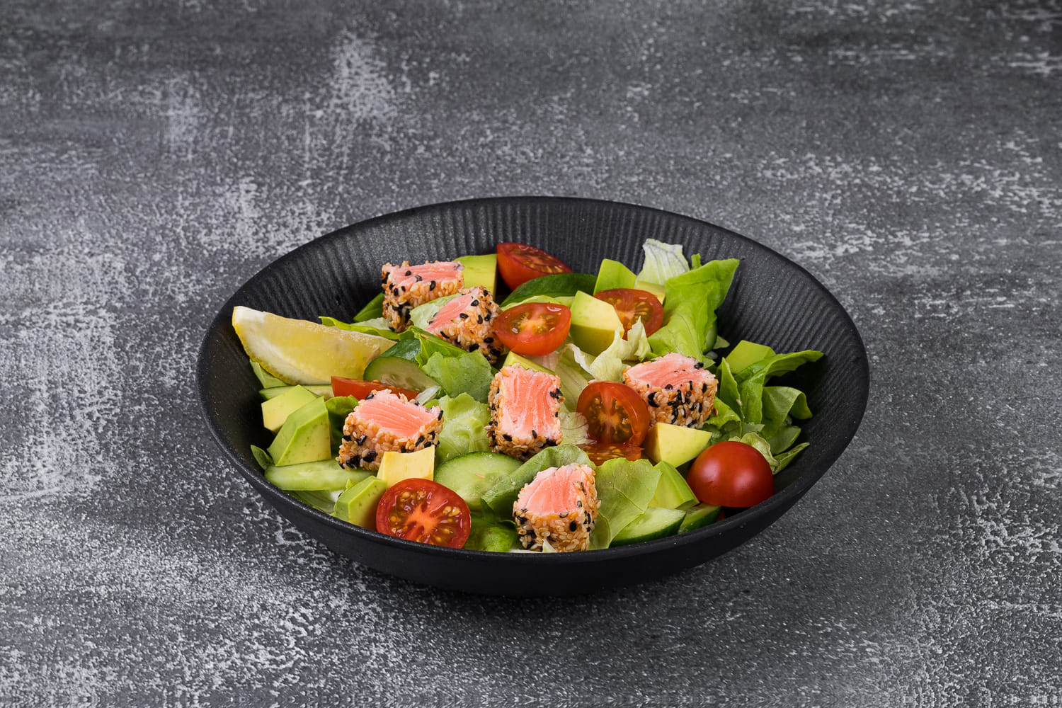 Composition: Iceberg lettuce, boston lettuce, tomato, avocado, cucumber, lemon, salmon, sesame, salmon salad dressing, 300g.