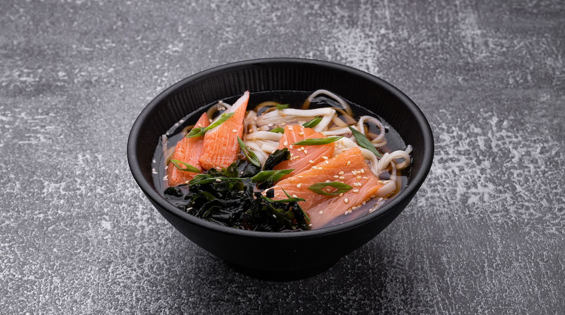 Composition: Clear broth, udon noodles, crab mix, wakame, salmon, green onion, white sesame