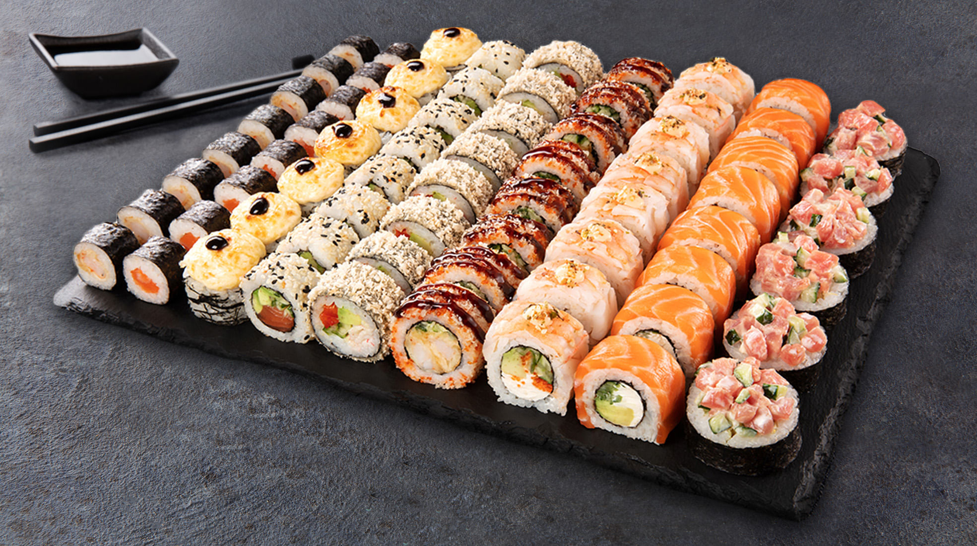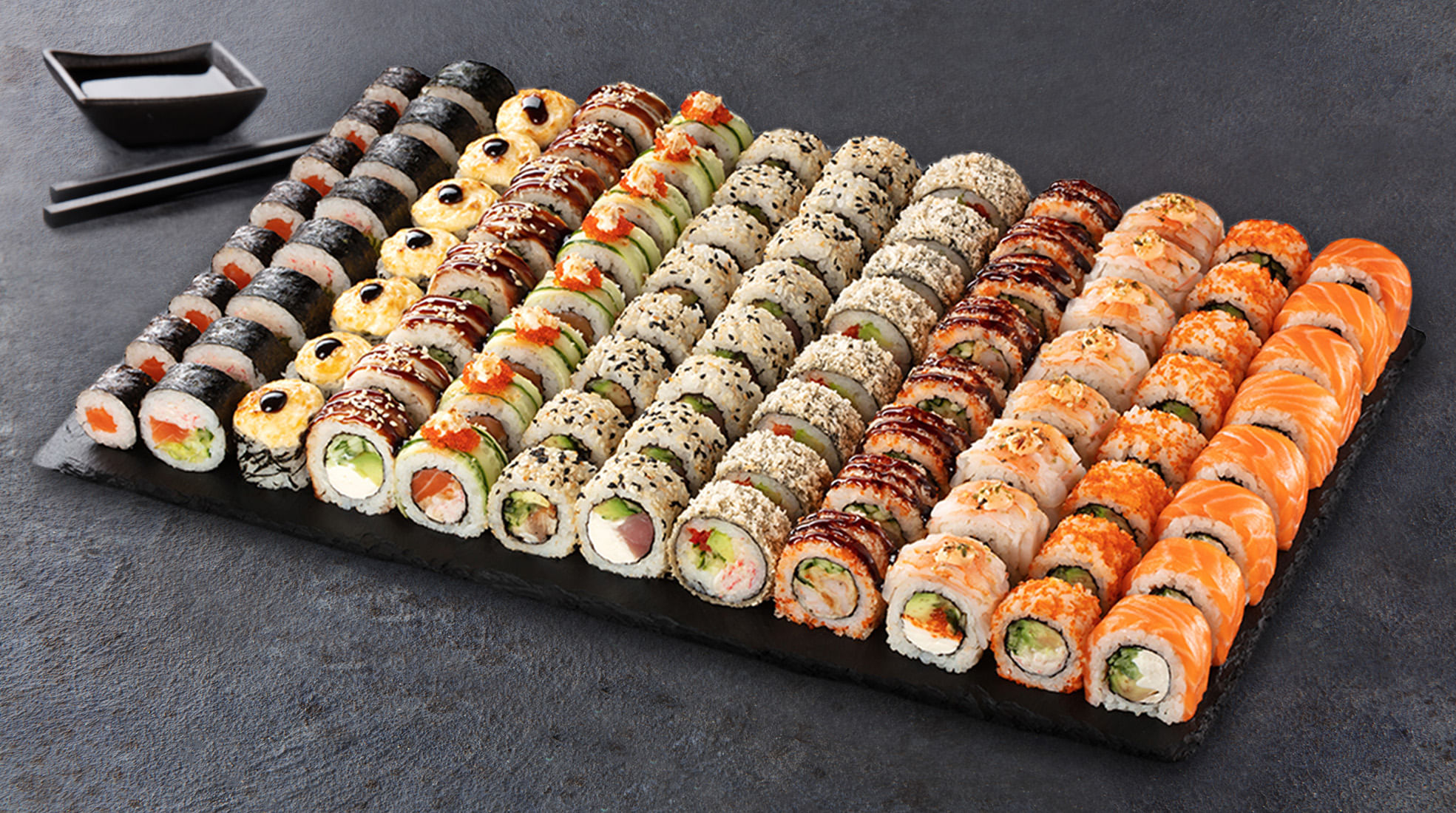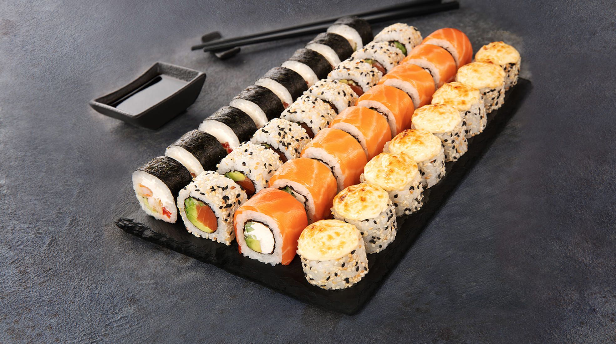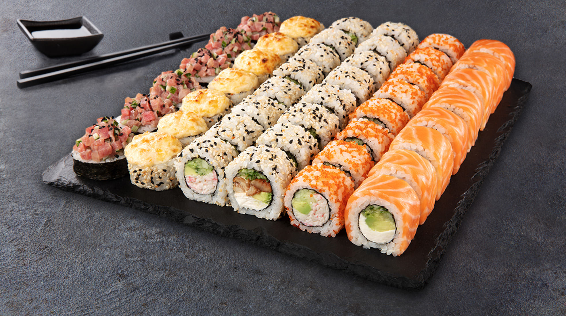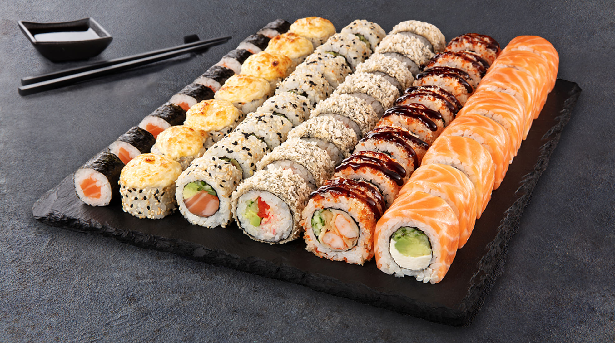 Philadelphia roll with salmon, philadelphia roll with eel, philadelphia roll with shrimp, philadelphia roll with tuna in sesame, california roll with crab mix in caviar, california roll with eel in sesame, california tempura roll, roll with salmon and cucumber, roll cranch with shrimp, maki roll with salmon, futomaki roll with salmon (spicy), delicate roll with salmon. Soy sauce - 400 ml (8 units). Ginger - 180 g. Wasabi - 60 g.