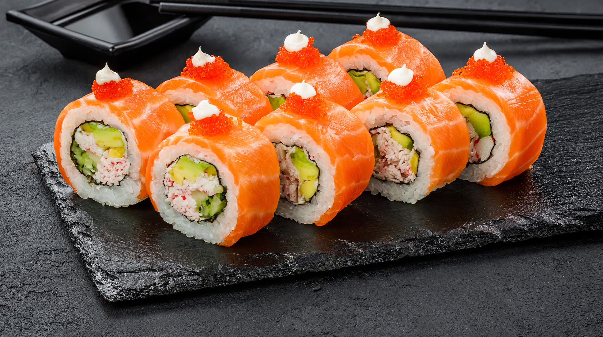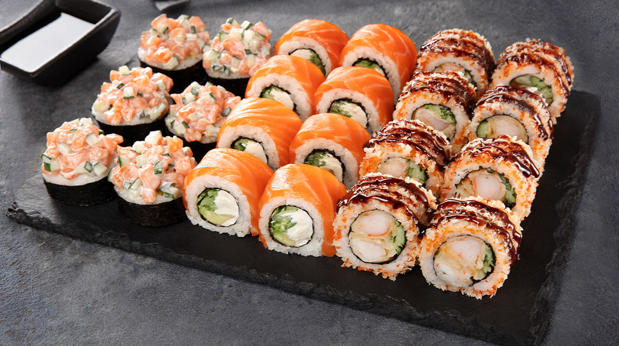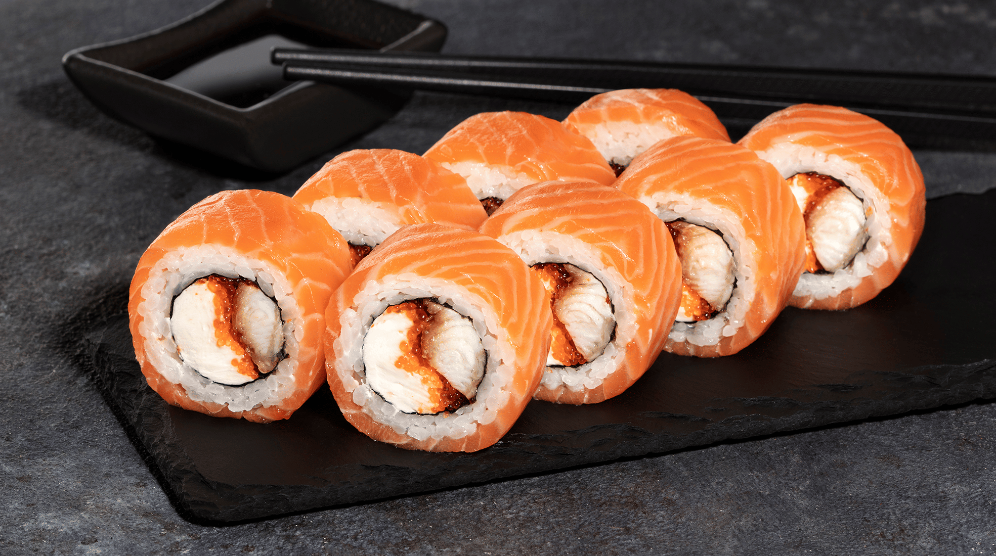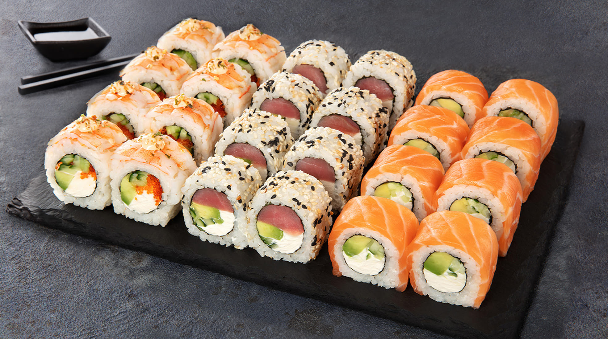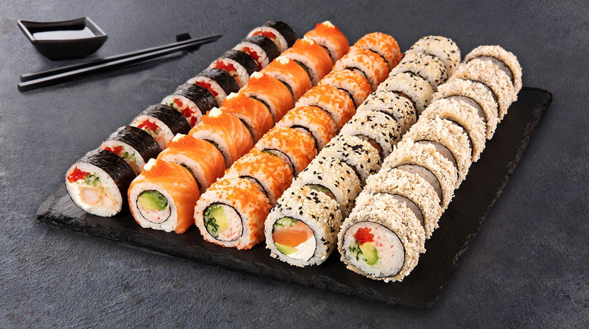 Philadelphia roll with salmon, philadelphia roll with eel, philadelphia roll with shrimp, philadelphia roll with tuna in sesame, california roll with crab mix in caviar, california roll with eel in sesame, california tempura roll, roll with salmon and cucumber, roll cranch with shrimp, maki roll with salmon, futomaki roll with salmon (spicy), delicate roll with salmon. Soy sauce - 400 ml (8 units). Ginger - 180 g. Wasabi - 60 g.
