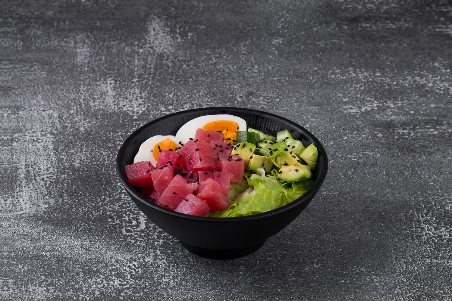 Steam rice, tuna, iceberg, cucumber, avocado, boiled egg, tonkatsu sauce, sesame, 300g.
