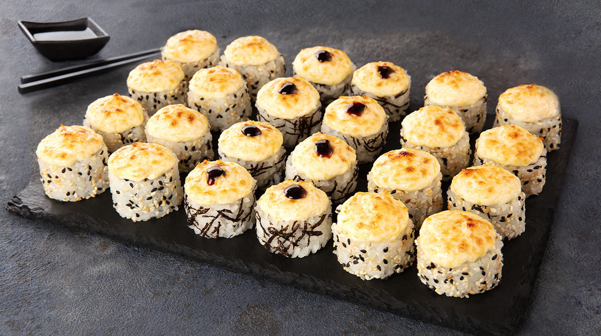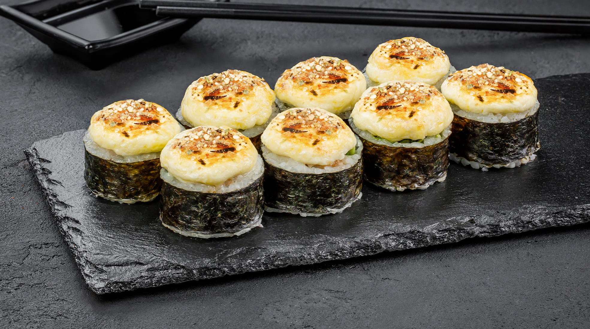 Philadelphia roll with salmon, california tempura roll, baked roll with crab mix, maki roll with tuna. Soy sauce - 150 ml (3 units). Ginger - 60 g. Wasabi - 20 g.