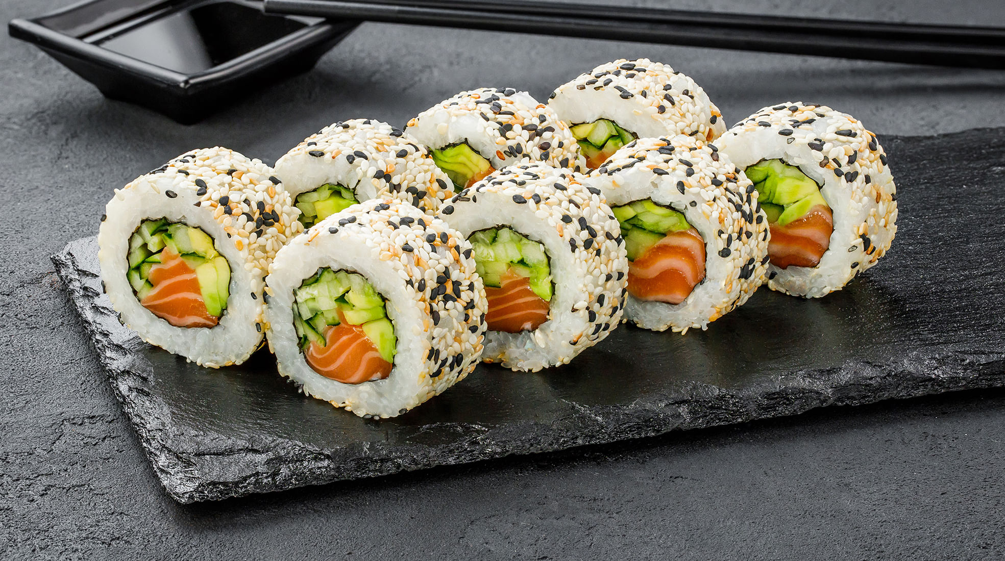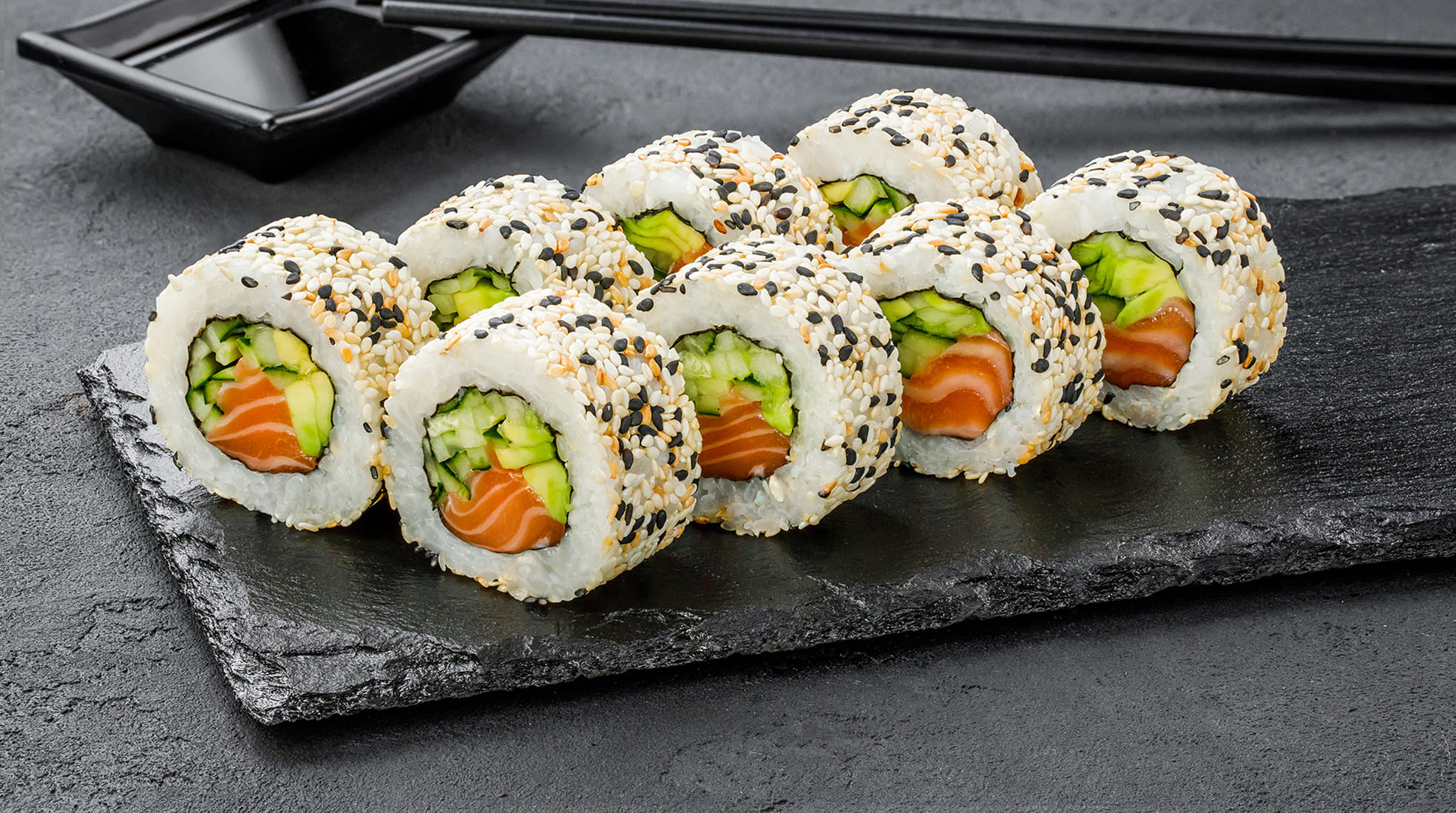 Rice, smoked salmon, avocado, cucumber, sesame seeds, nori