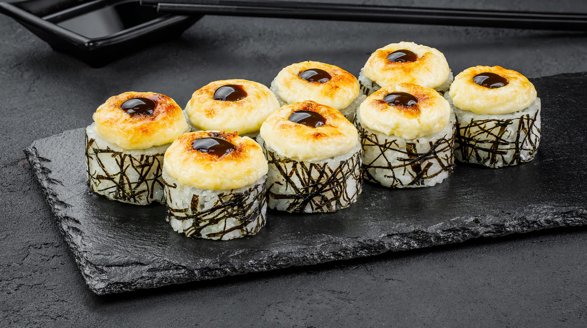 Rice, nori, caviar tobiko, batter tempura, cheese cream, cucumber, unagi sauce, crackers panco, ear