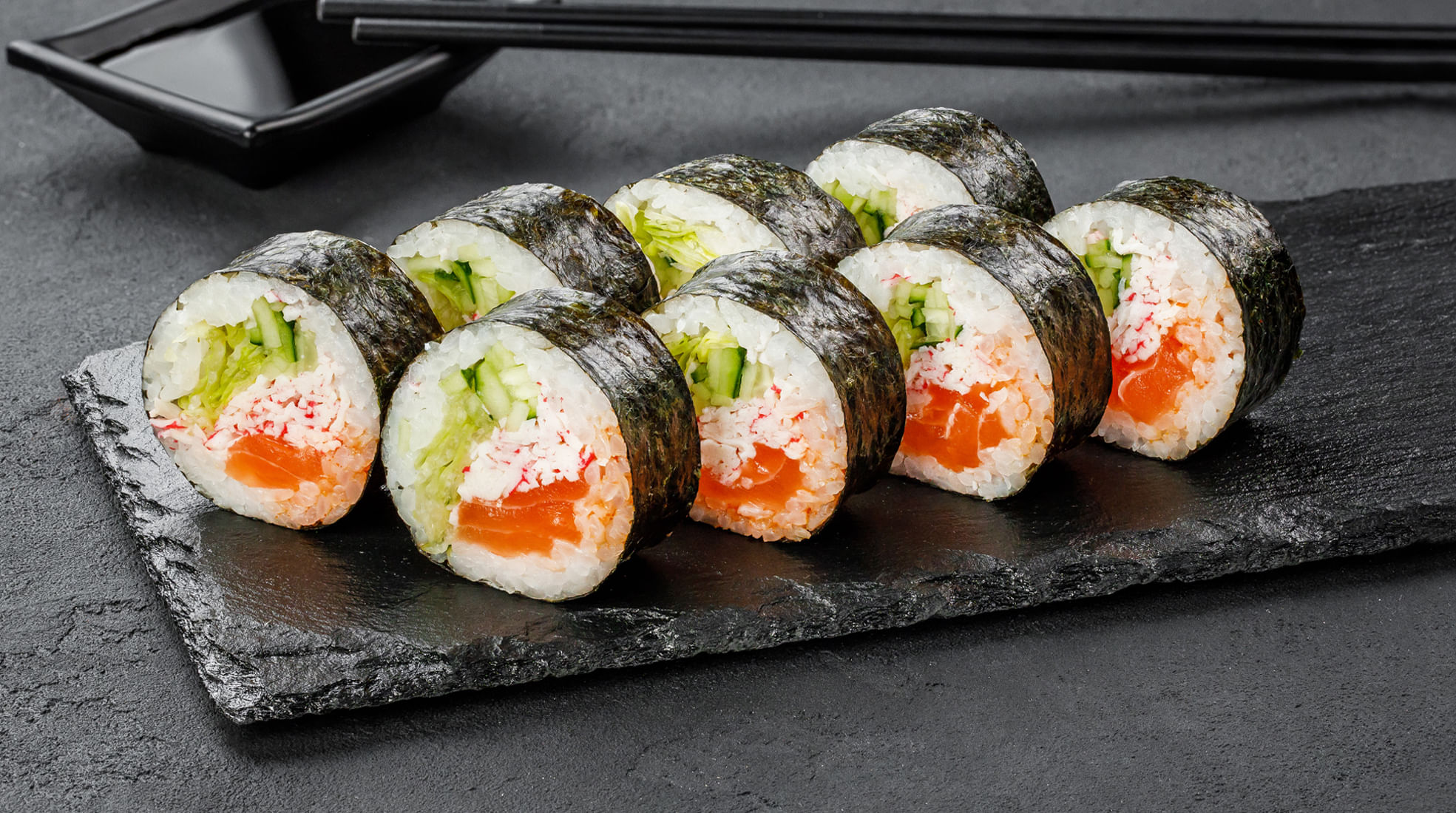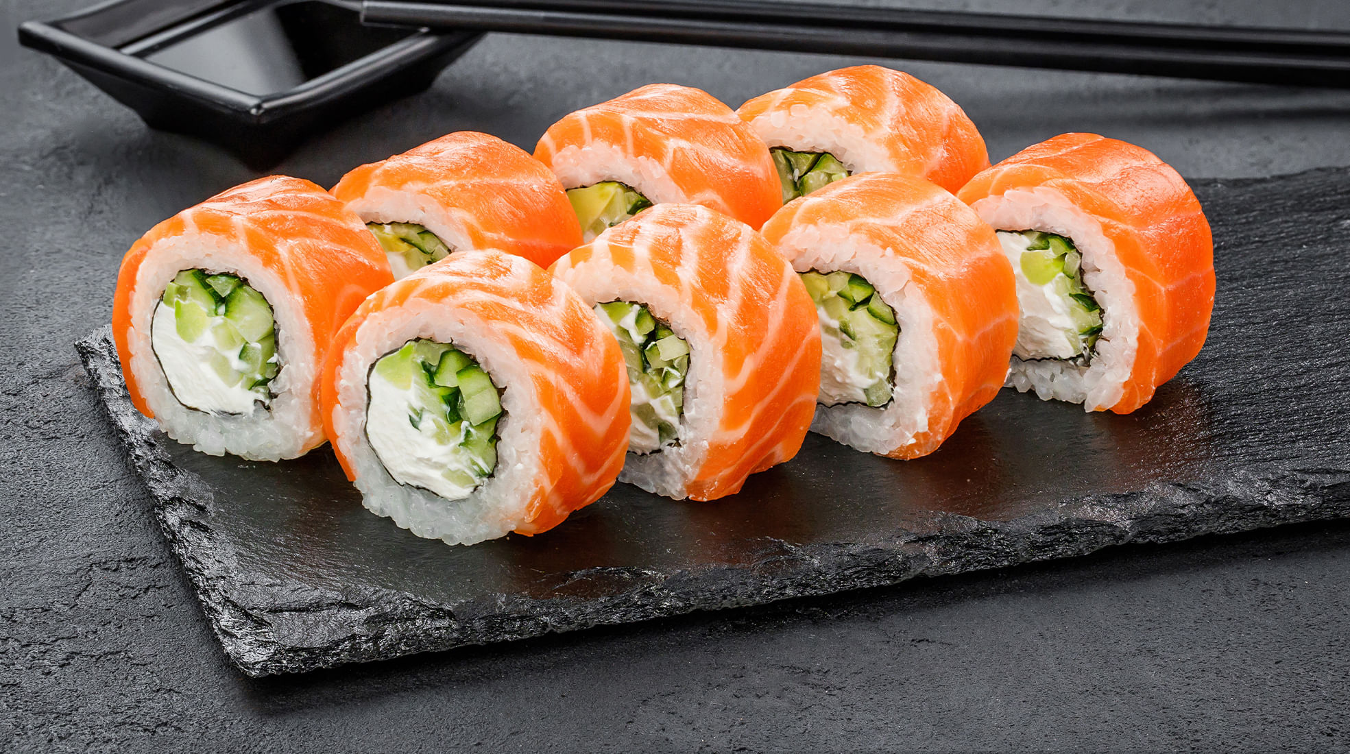 Rice, cream cheese, smoked salmon, avocado, cucumber, nori