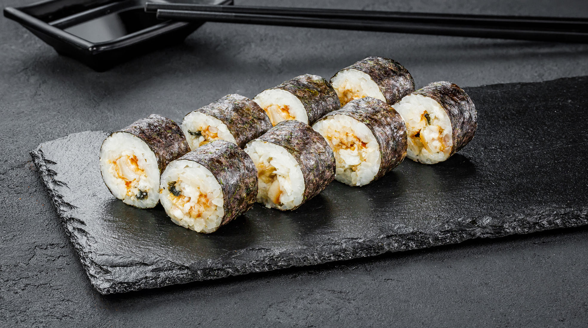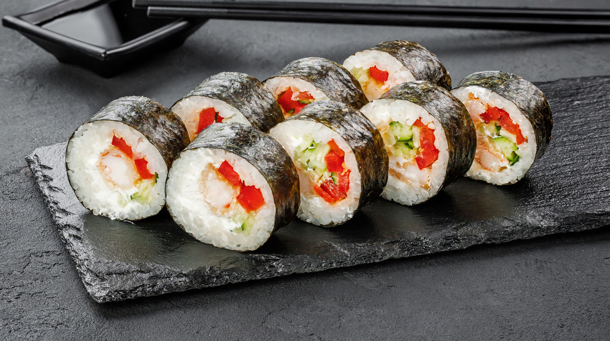 Rice, nori, crab mix, dungeon crane, avocado, cucumber, crackers panko, bulgarian pepper