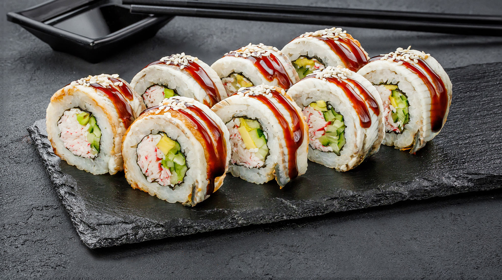 Rice, cucumber, eel, avocado, black and white sesame, crab mix, unagi sauce, nori