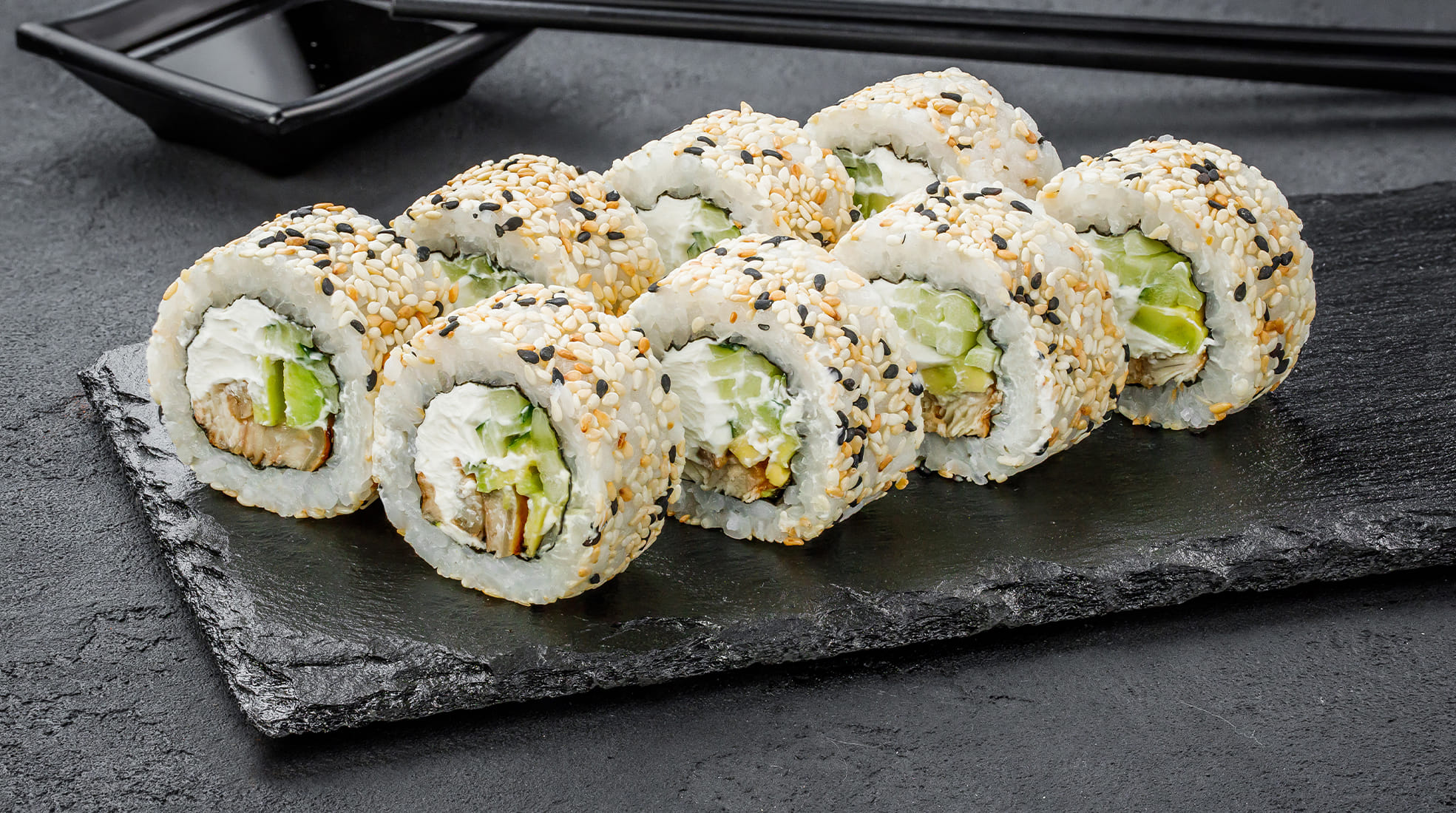 Rice, cream cheese, eel, avocado, cucumber, nori, unagi sauce, sesame seeds