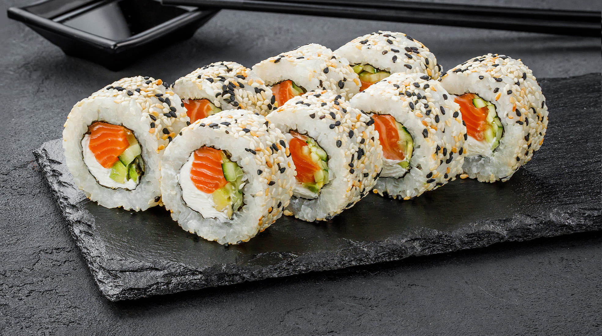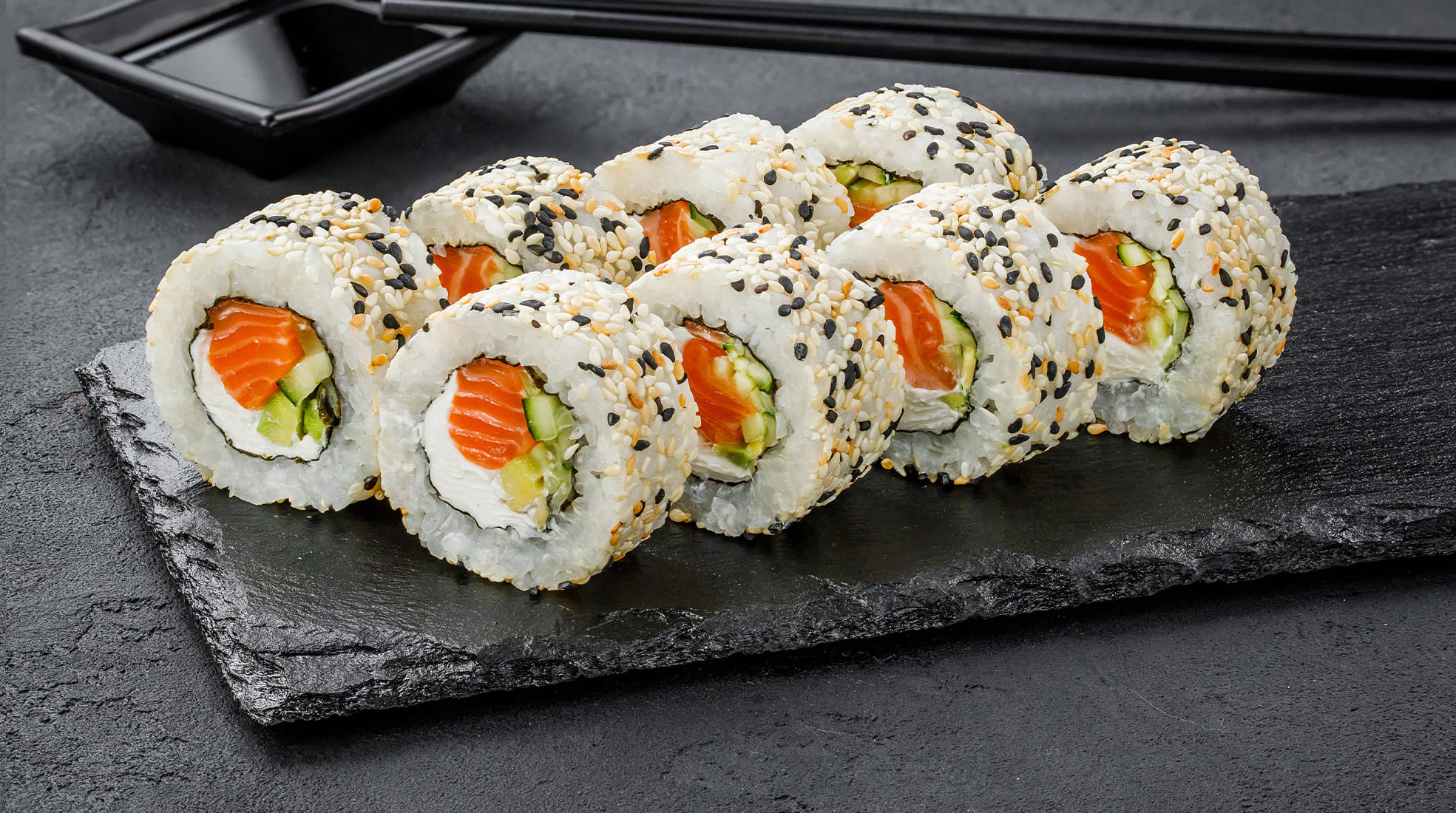 Rice, cream cheese, smoked salmon, avocado, sesame seeds, cucumber, nori