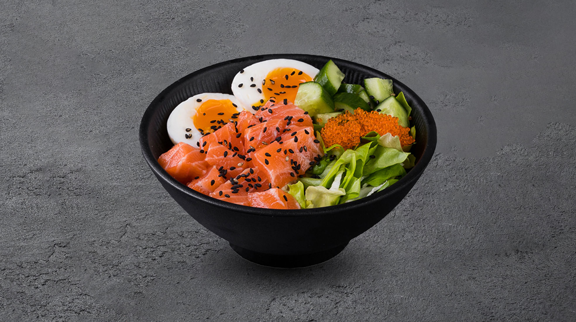 Steam rice, salmon, iceberg lettuce, cucumber, tobik caviar, boiled egg, salmon salad dressing, sesame, 300g.